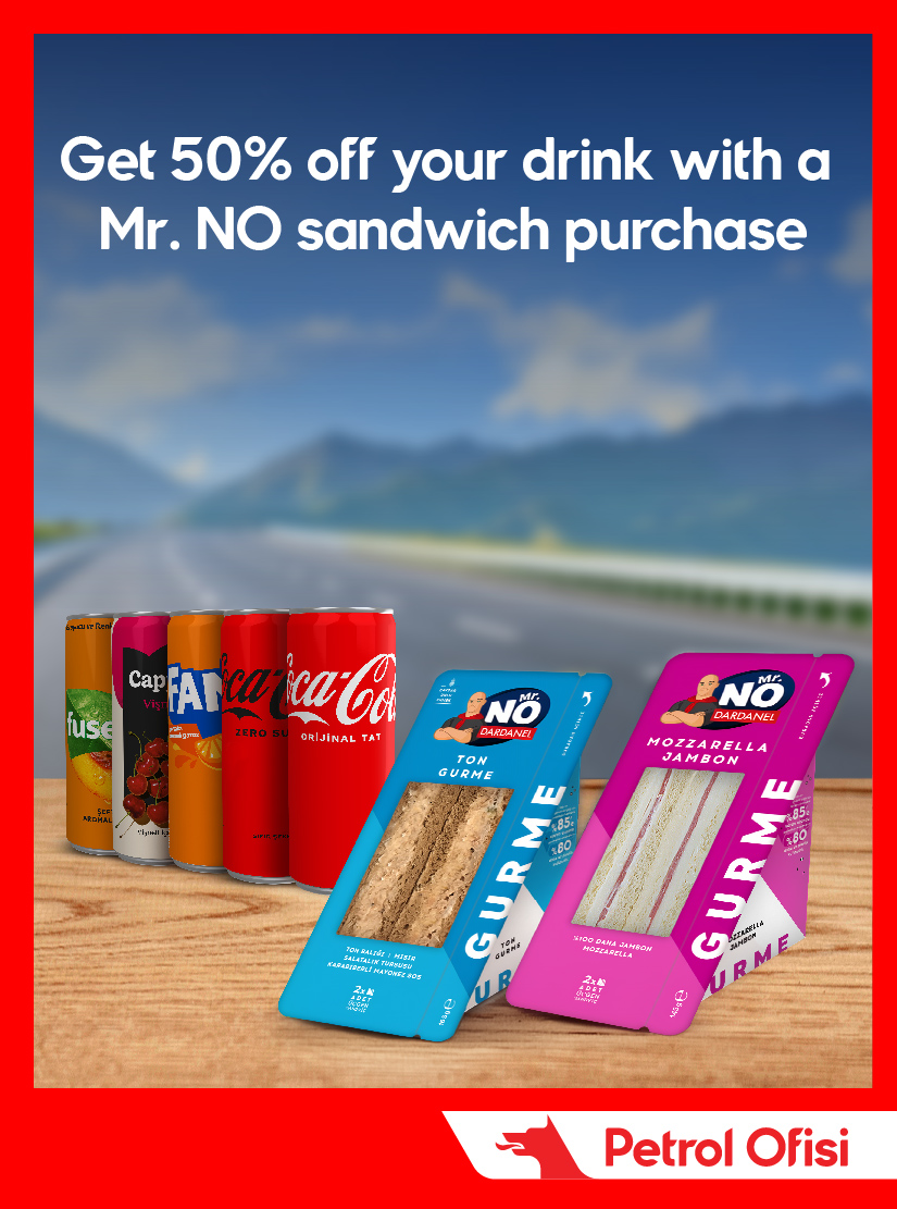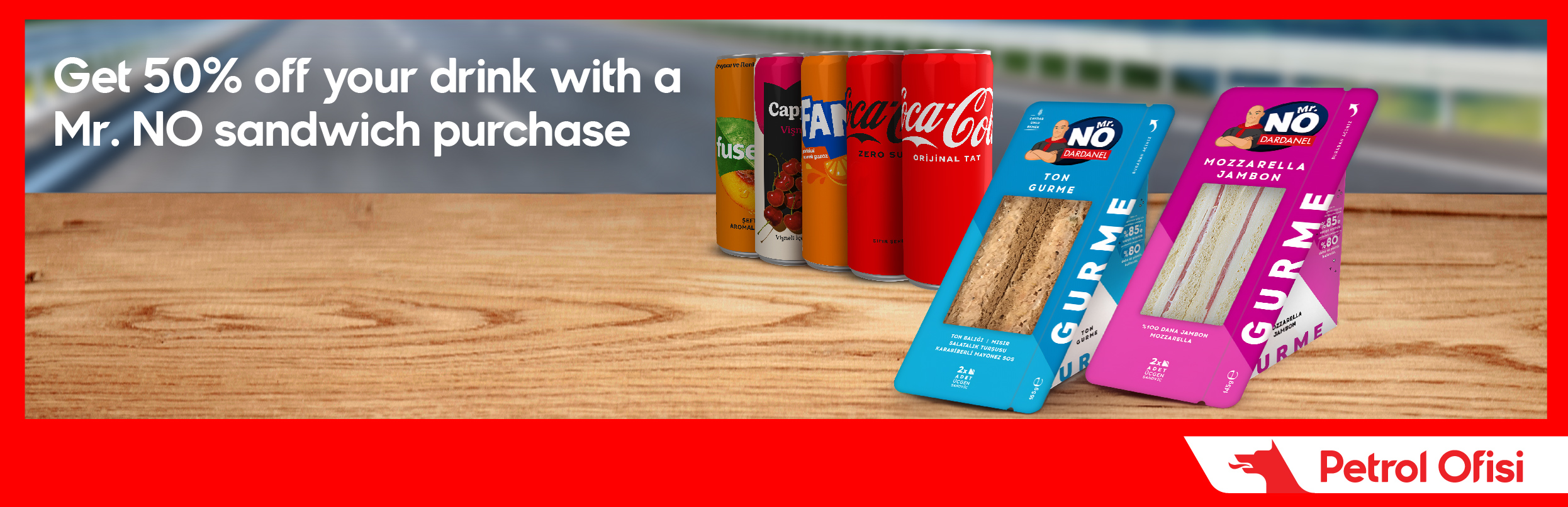 With the purchase of any Mr. No triangle sandwich, one of 330 ml drink varieties of Coca-Cola, Fanta, Sprite, Cappy, or Fuse Tea will be 50% off. For your health, consume 4–5 portions of fruits and vegetables daily.