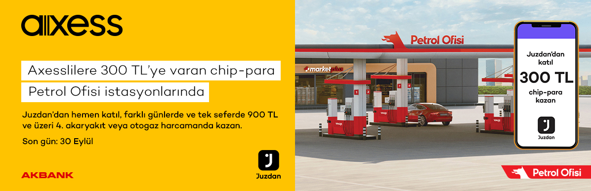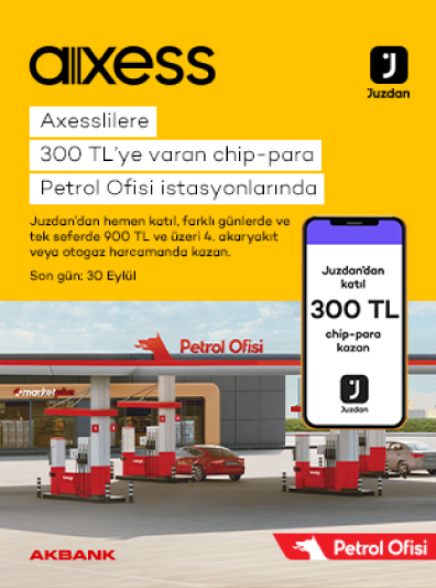 16 Agustos – 30 Eylül 2025 tarihleri arasında, kampanyaya katılan Axess üyesi Petrol Ofisi istasyonlarından farklı günlerde ve tek seferde yapacağınız 900 TL ve üzeri 4. akaryakıt veya otogaz harcamanıza, Juzdan’dan kampanyaya katılarak 300 TL chip-para, SMS ile kampanyaya katılarak 275 TL chip-para kazanma fırsatı!