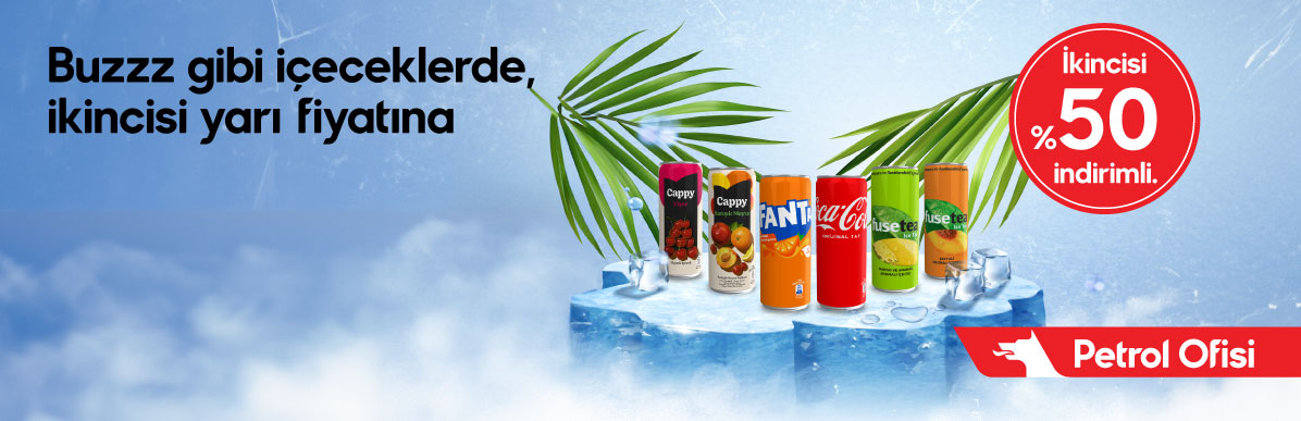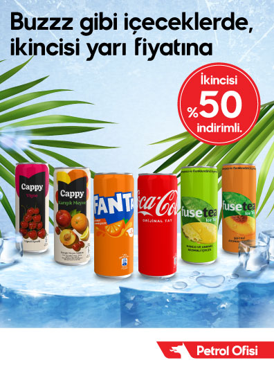 Kampanya 1-30 Haziran 2025 tarihleri arasında seçili istasyonlarda geçerli olacaktır. Herhangi bir Coca Cola 330, Fanta, Sprite, Fuse Tea, Cappy 330 ml çeşitlerinden birinin alımında ikinci Coca Cola 330, Fanta, Sprite, Fuse Tea, Cappy 330 ml ürün çeşitlerinden biri %50 indirimli olacaktır. Kampanya stoklarla sınırlıdır. Sağlığınız için günde 4-5 porsiyon sebze ve meyve tüketiniz.”