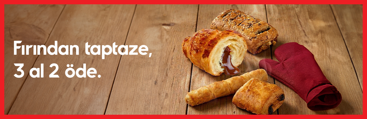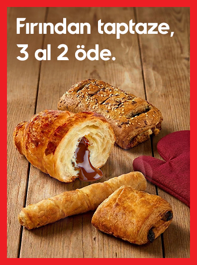 Fırından lezzetler ürün çeşitlerinden (börek, çörek, kruvasan, donut vs) toplamda 3 adet ürün alımında en düşük fiyatlı olan ürün kasada ücretsiz olacaktır. Sağlığınız için günde 4-5 porsiyon sebze ve meyve tüketiniz.