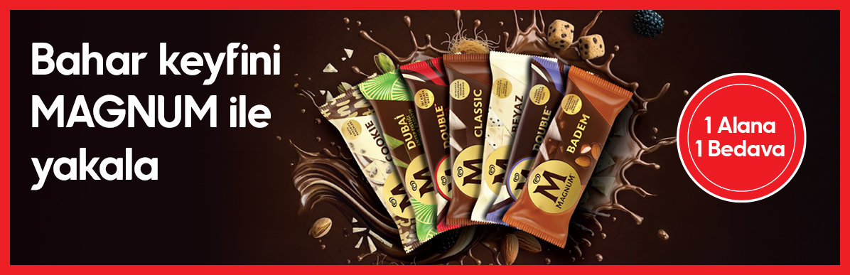 2 adet Magnum dondurma alımında düşük fiyatlı olanı ücretsiz olacaktır, indirim kasada yansıyacaktır. Sağlığınız için günde 4-5 porsiyon sebze-meyve tüketiniz. Kampanya stoklarla sınırlıdır.