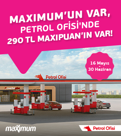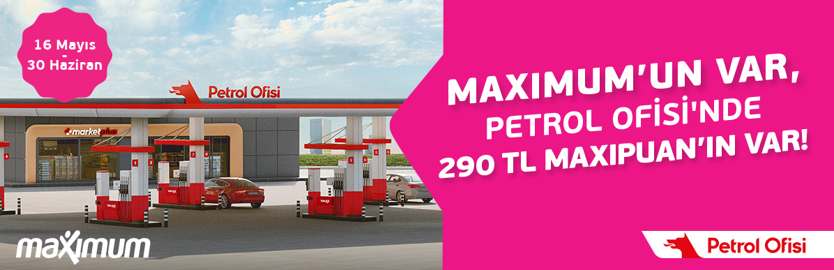 - Maximum anlaşmalı Petrol Ofisi istasyonlarından 16 Mayıs – 30 Haziran 2025 tarihleri arasında tek seferde ve farklı günlerde yapacağınız 900 TL ve üzeri 4. yakıt alışverişinize 240 TL MaxiPuan, alışverişlerinizden en az birini temassız Maximum Kart’ınızın Öde Geç özelliği veya Maximum Mobil'in içindeki Pazarama'dan Petrol Ofisi Öde-Geç ile yapmanız durumunda toplam 290 TL MaxiPuan hediye edilecektir.