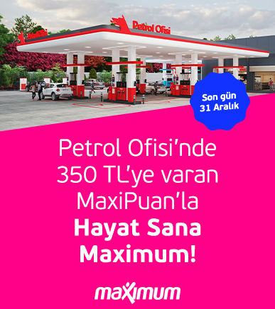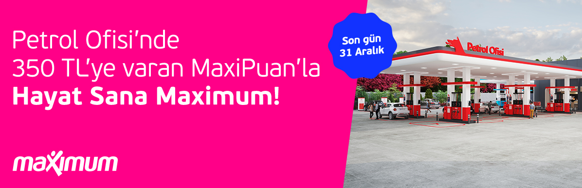 - Maximum anlaşmalı Petrol Ofisi istasyonlarından 16 Kasım – 31 Aralık 2025 tarihleri arasında tek seferde ve farklı günlerde yapacağınız 1.000 TL ve üzeri 4. yakıt alışverişinize 300 TL MaxiPuan, alışverişlerinizden en az birini Pazarama, Maximum Mobil veya İşCep içerisinde yer alan Araçta Öde ile yapmanız durumunda toplam 350 TL MaxiPuan fırsatı sizi bekliyor.