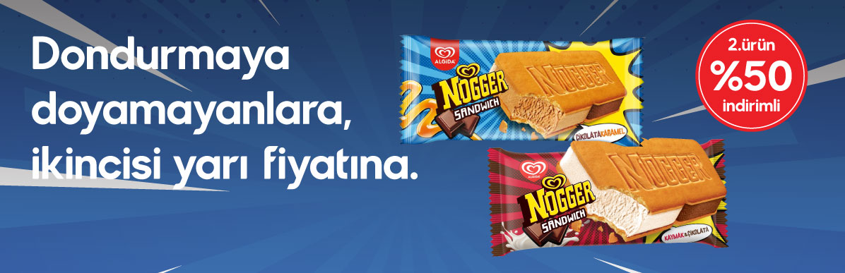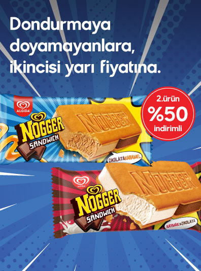 2 adet Nogger Dondurma alımında, ürünlerin biri %50 indirimli olacaktır. Sağlığınız için günde 4-5 porsiyon sebze-meyve tüketiniz.