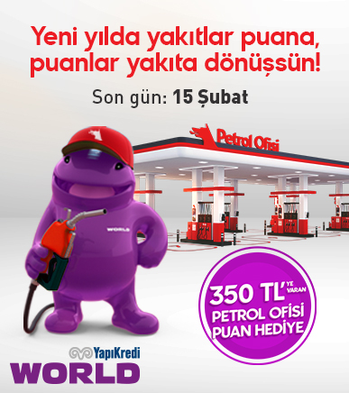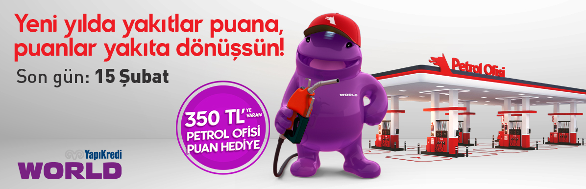 1 Ocak-15 Şubat 2026 tarihleri arasında, ilk alışverişten önce kampanyaya katılmak üzere SMS gönderen veya World Mobil uygulamasından kampanyaya katılan Yapı Kredi World üye işyeri Petrol Ofisi istasyonlarından tek seferde ve farklı günlerde 4 defa 1000 TL ve üzeri akaryakıt veya otogaz alışverişi yapan, Yapı Kredi Bireysel kredi kartı, Yapı Kredi Bireysel TLcard veya Business kredi kartı sahibi müşteriler, 22 Şubat 2026 tarihinden itibaren akaryakıt ve otogaz alışverişinde kullanılmak üzere 300 TL Petrol Ofisi Puan kazanacaktır. “Petrol Ofisi istasyonlarında 1000 TL ve üzeri 4 harcamadan birini World Pay POS’ta QR Kod ile gerçekleştirenlere toplamda 350 TL’ye varan Petrol Ofisi Puan” kampanyasına katılan kart sahibi müşteriler 4 işlemden en az birinin World Pay POS’ta QR Kod ile gerçekleştirildiği durumda 300 TL’ye ek 50 TL, toplam 350 TL Petrol Ofisi Puan hediye edilecektir. Ayrıca, Yapı Kredi POS kullanan esnaf ve KOBİ’lere ekstra 50 TL Petrol Ofisi Puan daha hediye edilecektir.