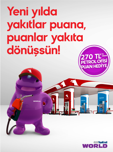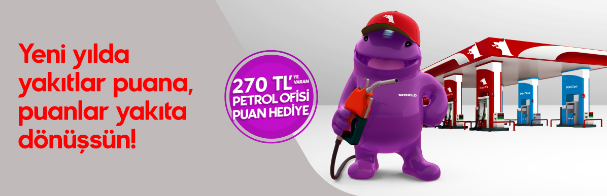 World üyesi Petrol Ofisi istasyonlarından Yapı Kredi kredi kartı ile farklı günlerde 4 adet 800TL ve üzeri akaryakıt alışverişine 270 TL'ye varan Yapı Kredi Petrol Ofisi Puan Hediye!